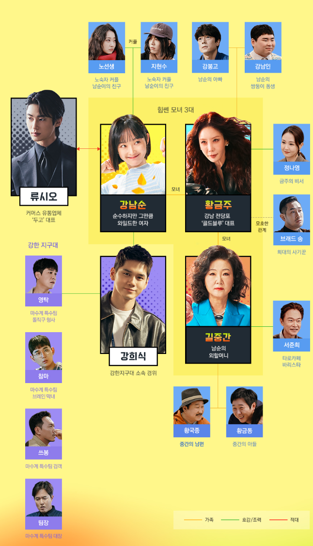 범죄를 소탕하는 판타지 히어로장르 힘센여자 강남순은 타고난 괴력을 가진 3대 모녀가 등장해 강남을 무대로 벌어지는