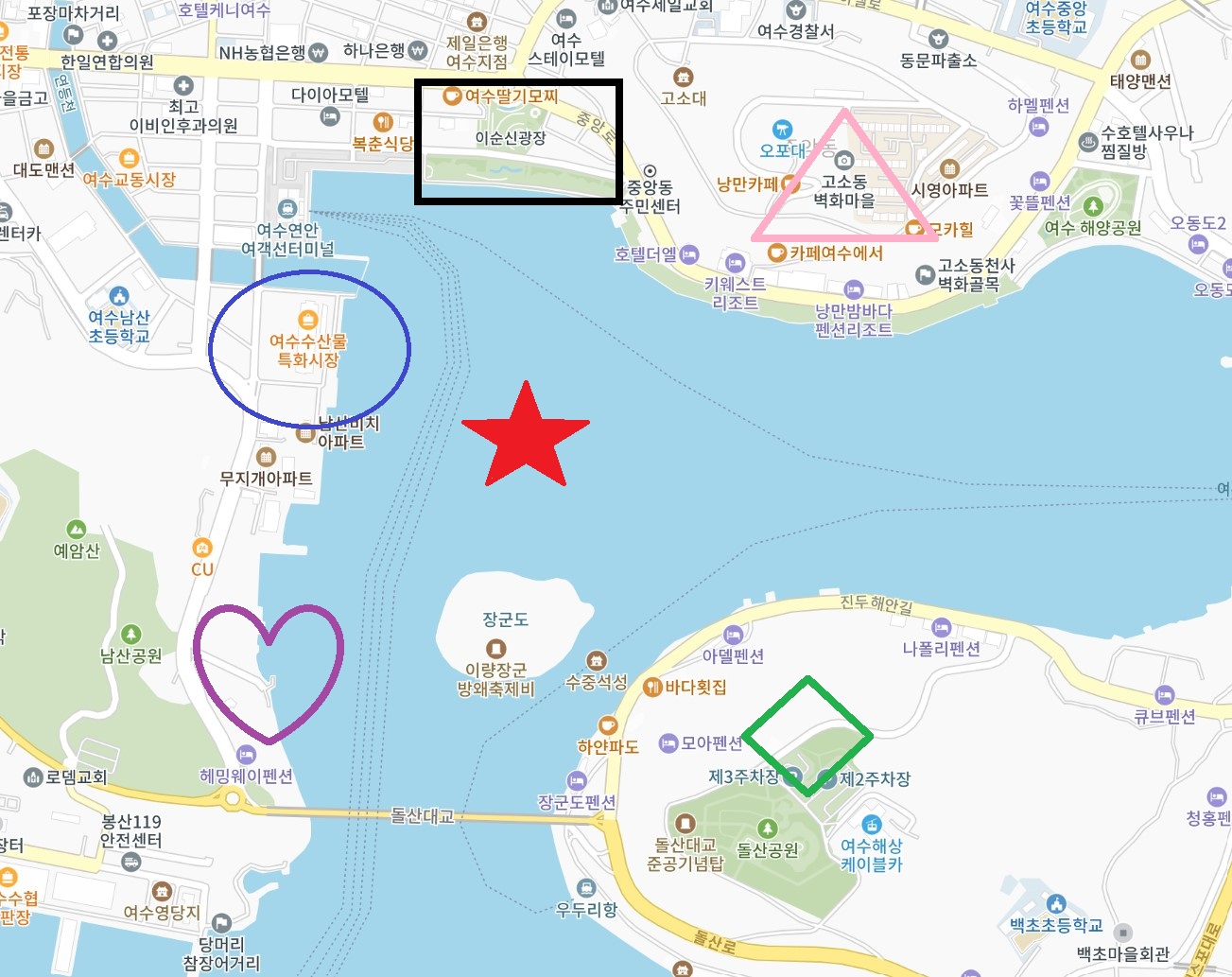●여수 수산물 특화시장 (파란 동그라미)